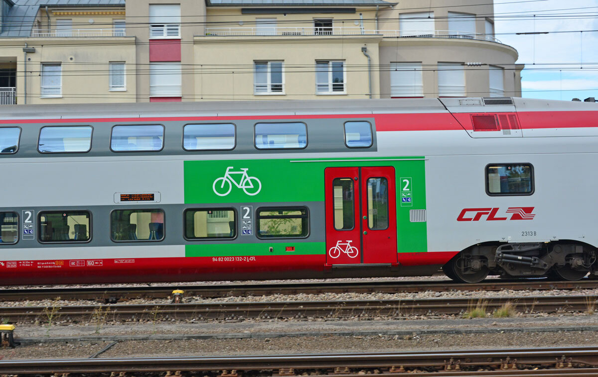 0 ToSt 20190901-N169a Treinstel 2313. In 2019 werd de zichtbaarheid van het fietsencompartiment verbeterd door een groot groen vlak.Pétange, 1 september 2019Ton Stevenhagen Tags: #cfl-2300 #elektrische-treinstellen #fietsvervoer #jaartal-2019 #petange #ton-stevenhagen