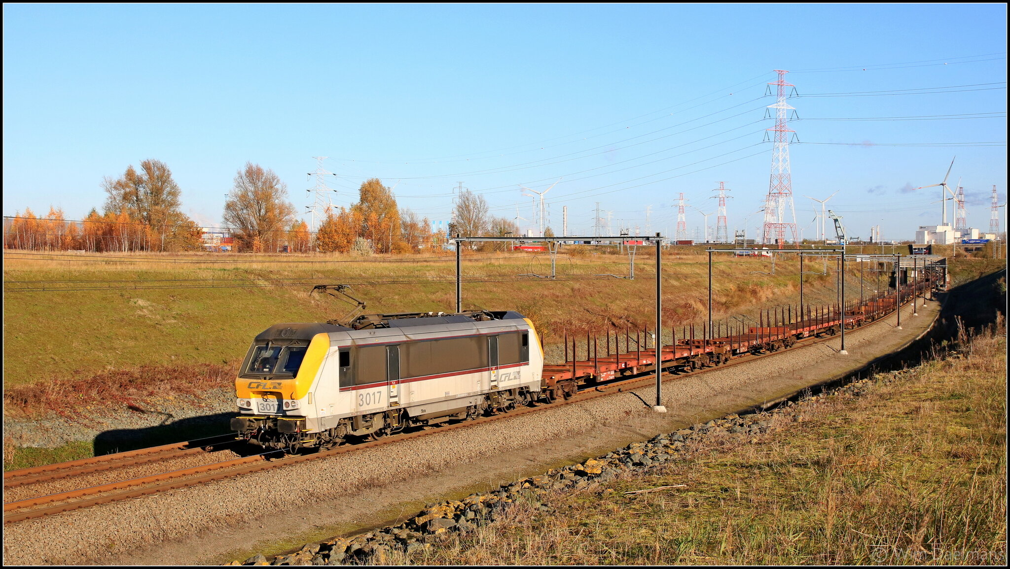CFL 3017 sleept LINEAS-trein 45709 van Antwerpen-Noord naar Bettembourg. Op 22 november 2021 wordt de trein omgeleid via Gent wegens werken op lijn 27A. Hier zien we de trein op het middaguur bij het verlaten van de Antigoon tunnel te Kallo nabij de uitrit van de Antigoontunnel. Fotograaf: Wim Daelmans