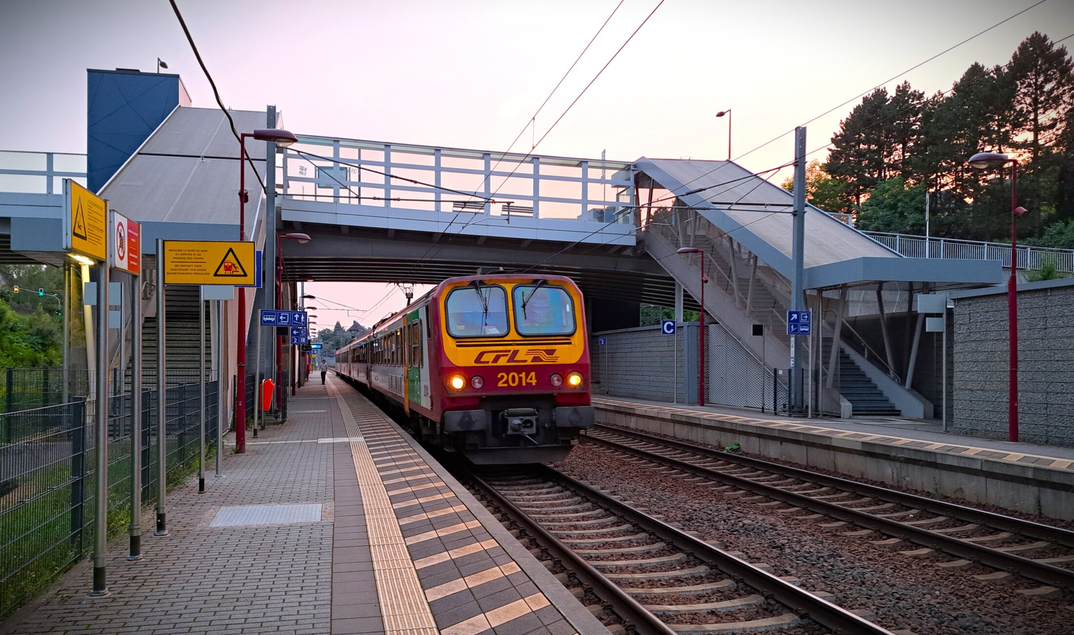 In het avondzonnetje komen treinstellen 2014 en 2020 het station van Cents-Hamm binnen gereden als RB naar Wasserbillig. Cents-Hamm, 18 augustus 2024. Fotograaf: Sebastiaan de Bruyn.