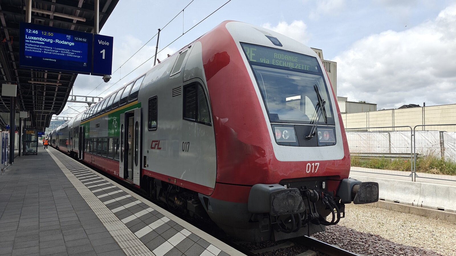 Een door de CFL 4011 getrokken dubbeldekkertrein met stuurstandrijtuig 017 op het eind is zojuist vanuit Troisvierges gearriveerd op station Ettelbrück. Over enkele ogenblikken vervolgt de trein zijn weg richting Rodange. Ettelbrück, 4 juni 2025. Fotograaf: Tim Wijkman