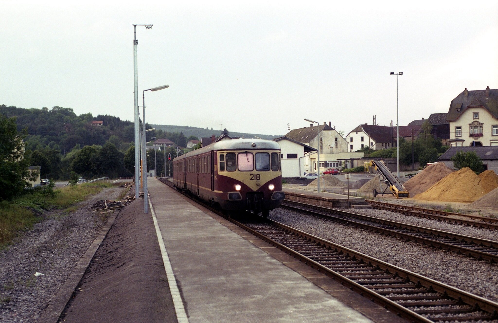 Westwaggon stellen 201-210 komen in de zomer van 1992 opnieuw aan in Wilwerwiltz. De modernisering van het spoor is in volle gang en de masten en de elektriciteit boven het spoor komt eraan. Wilwerwiltz, 18 augustus 1992. Fotograaf: Adriaan de Vreugd