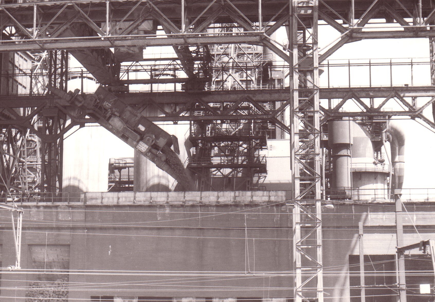 Een foto uit de oude doos. Vanaf het openbaar toegankelijk perron van het station Dudelang-Usines keek je zo naar het lossen van een goederenwagen bij de hoogoven. Achteraan de hoogoven. Of de stuivende kolen een milieuprobleem waren? Blijkbaar in 1979 nog niet. Dudelange Usinesz, 5 juli 1979. Fotograaf: Wim Kusee