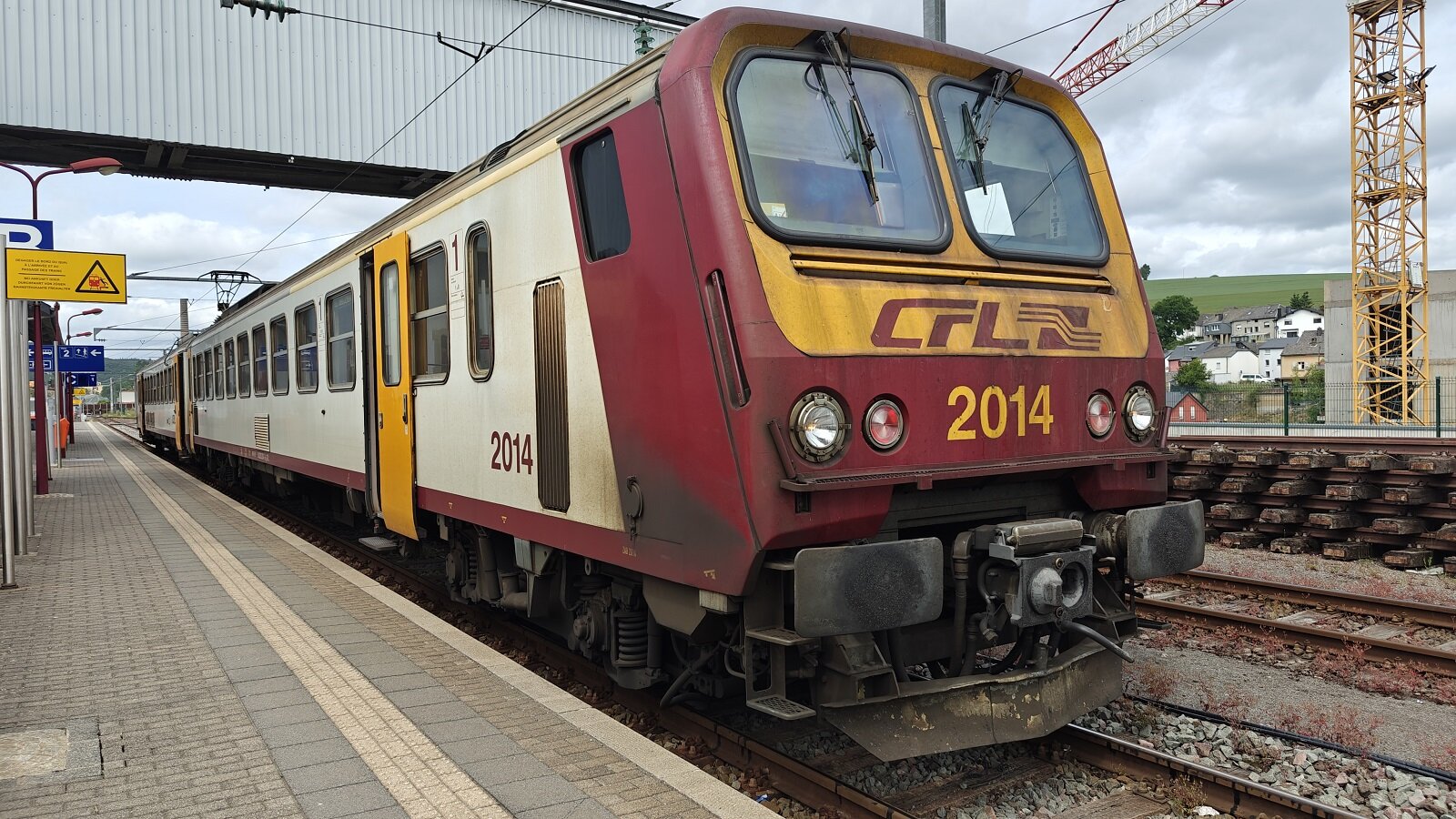 CFL 2014 pendelt vandaag tussen Kautenbach en Wiltz. Terwijl de 2014 in Wiltz staat, staat de 2004 in Kautenbach. Het zijn de laatste momenten dat deze treinstellen in actieve dienst in Luxemburg gespot kunnen worden. Uiteindelijk worden in de loop van 2025 de meeste treinstellen uit de CFL 2000-serie afgevoerd naar Roemenië. Dit treinstel, de 2014, wordt getipt al het toekomstige museumtreinstel. Wiltz, 4 juni 2025. Fotograaf: Tim Wijkman