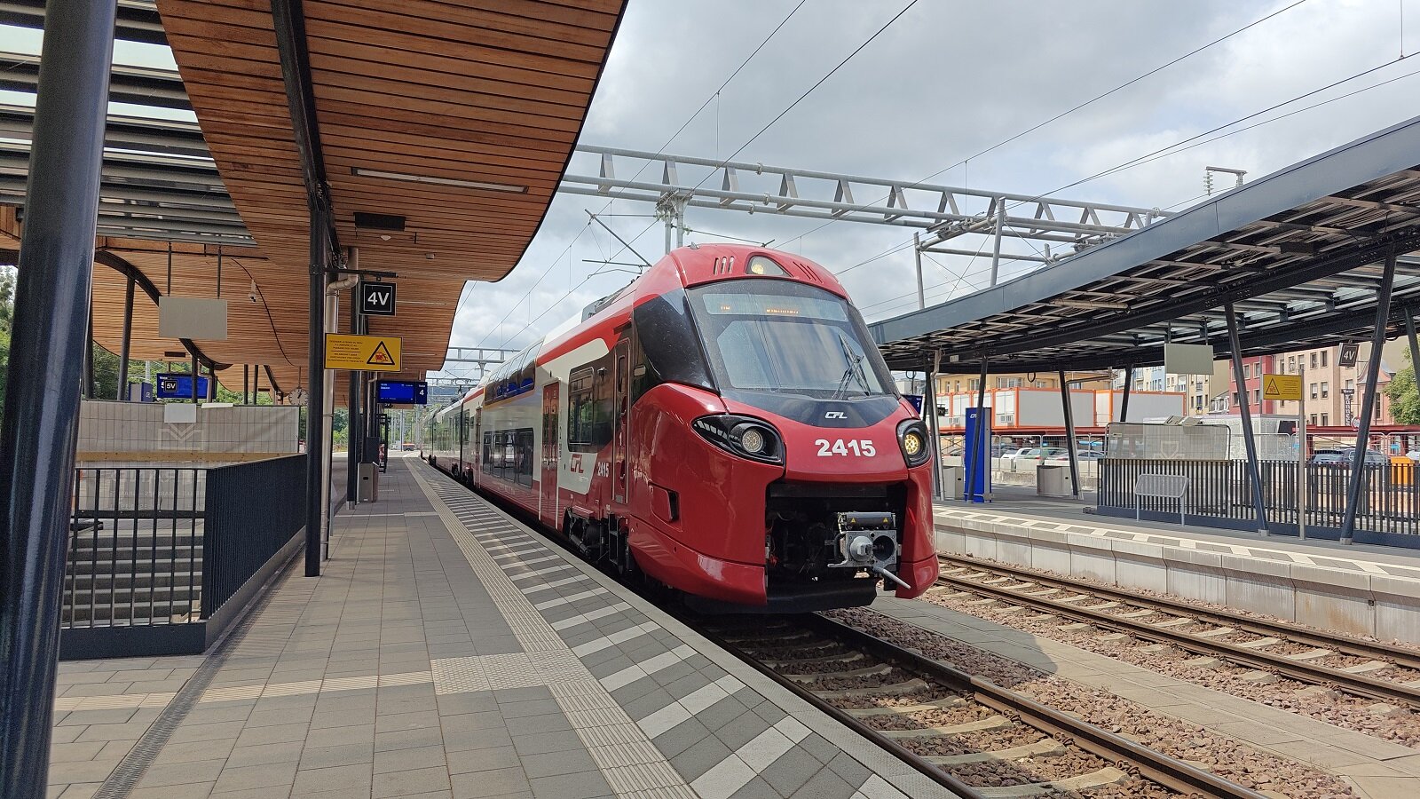 Het station van Ettelbrück is al jaren een bouwput. Het klassieke stationsgebouw is gesloopt en het station is uitgebreid naar twee eilandperrons. De overkapping van spoor 3 en 4 is af. In de passages onder de sporen wordt nog hard gewerkt aan de afwerking. De overkapping van spoor 2 en 3 moet nog afgewerkt worden. Hier arriveert het nieuwe treinstel CFL 2415 vanuit Luxemburg op weg naar zijn eindbestemmming Diekirch. Ettelbrück, 4 juni 2025. Fotograaf: Tim Wijkman