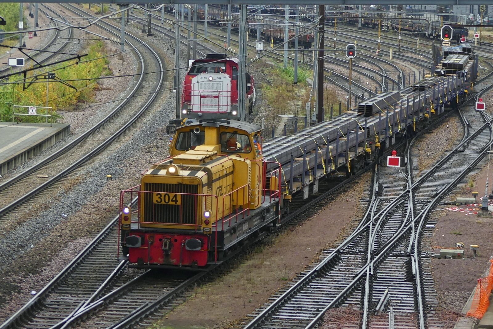 CFL Cargo 304 trekt een beladen goederentrein uit het depot van Belval Université. Belval Université, 23 oktober 2023. Hans de Rond